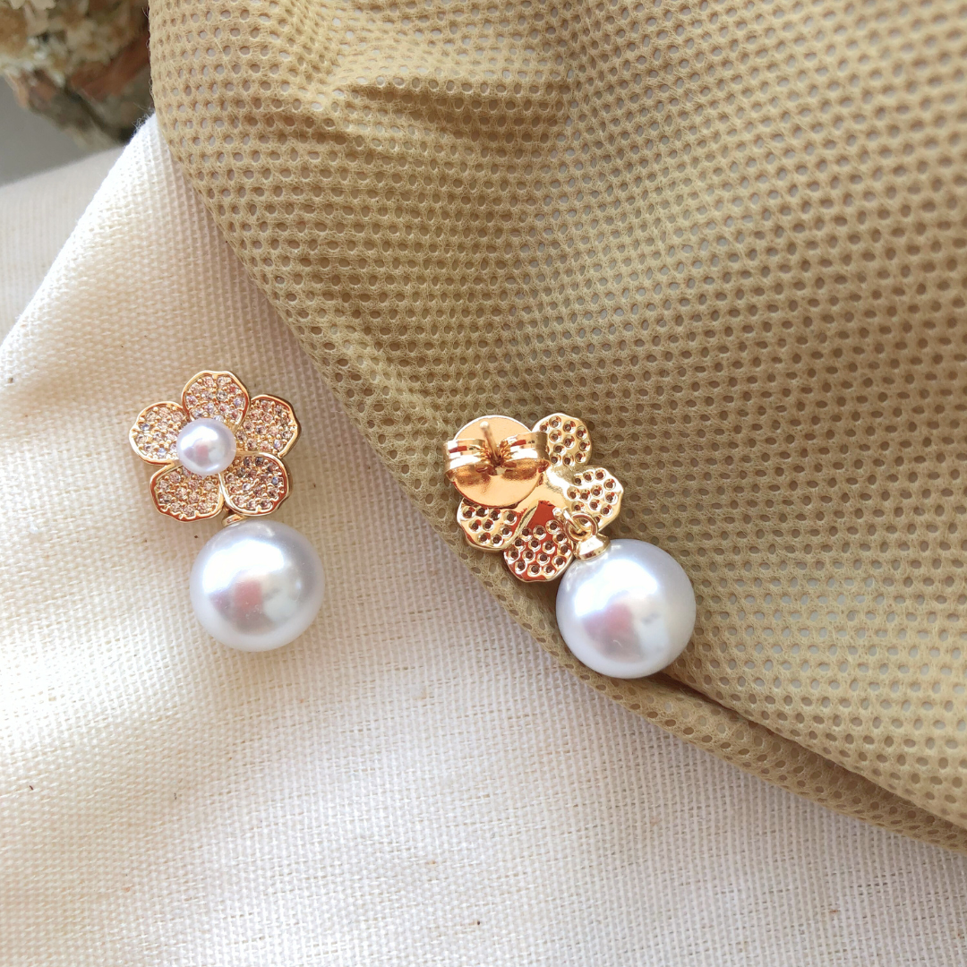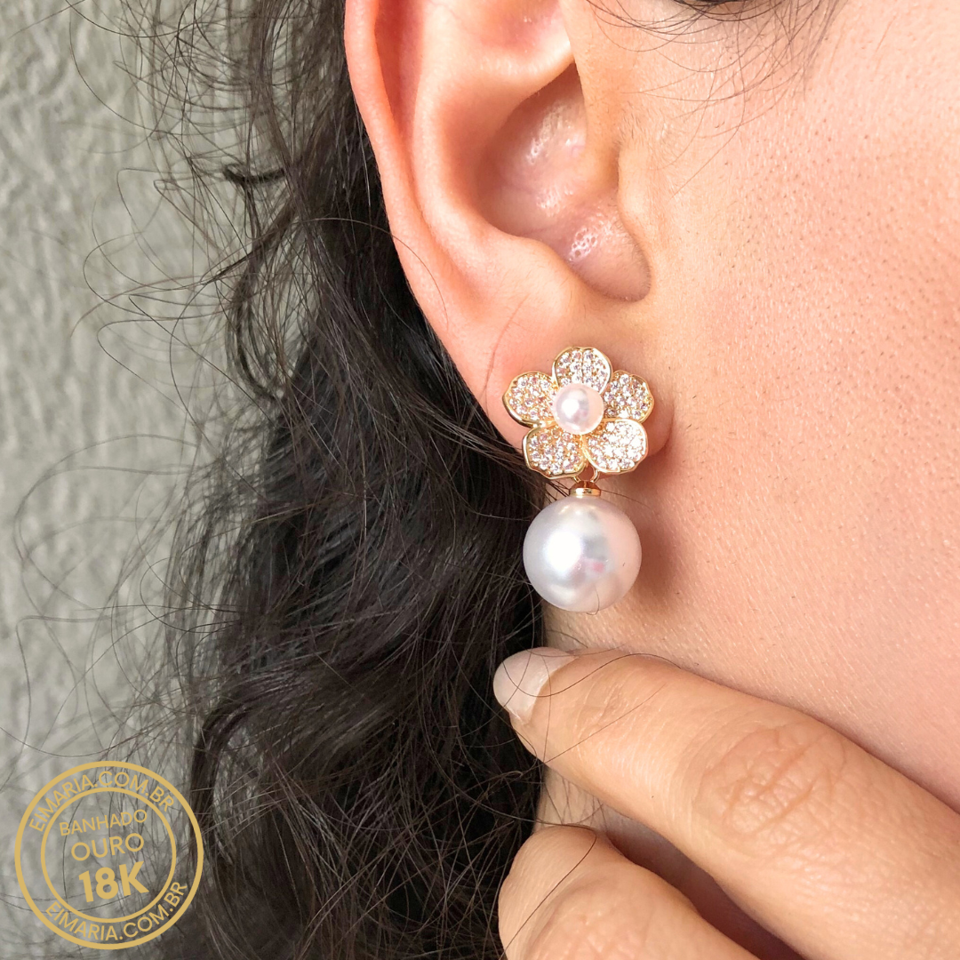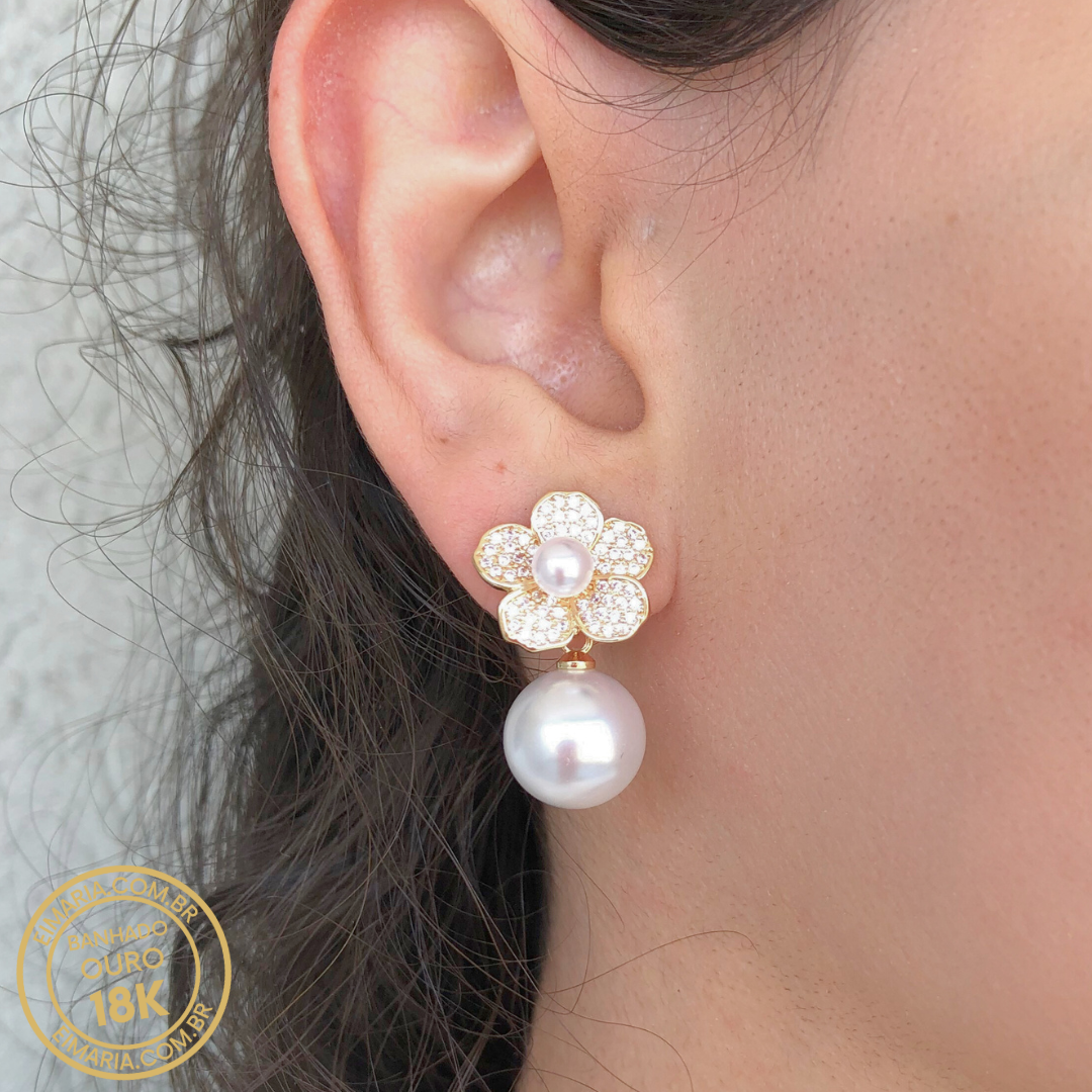 Aurora pearl: Um brinco delicado que une a sofisticação da pérola com o brilho suave da flor cravejada em dourado.