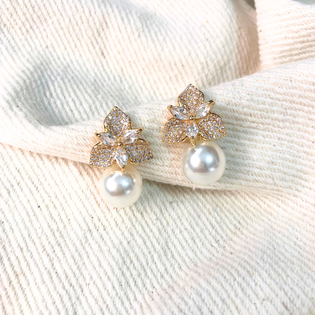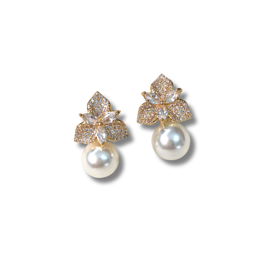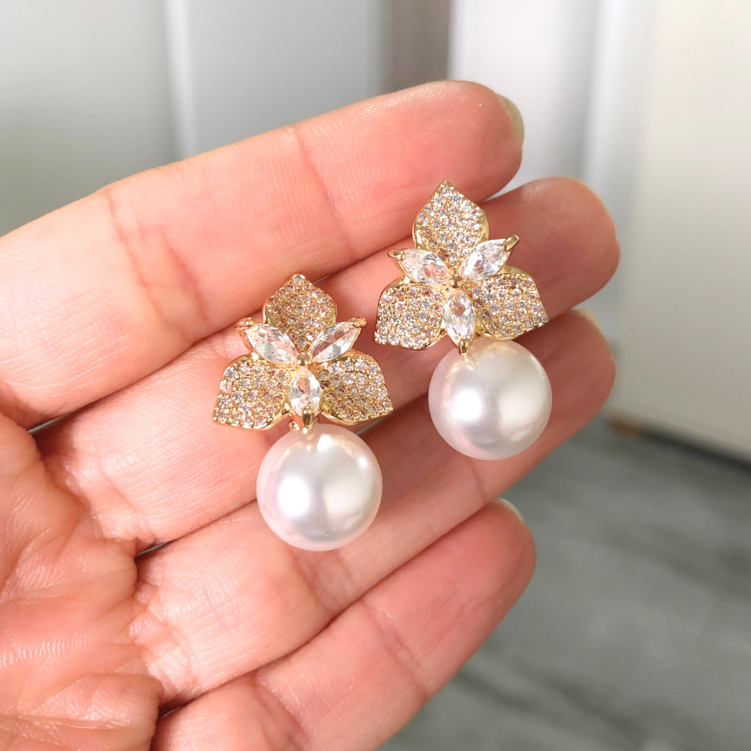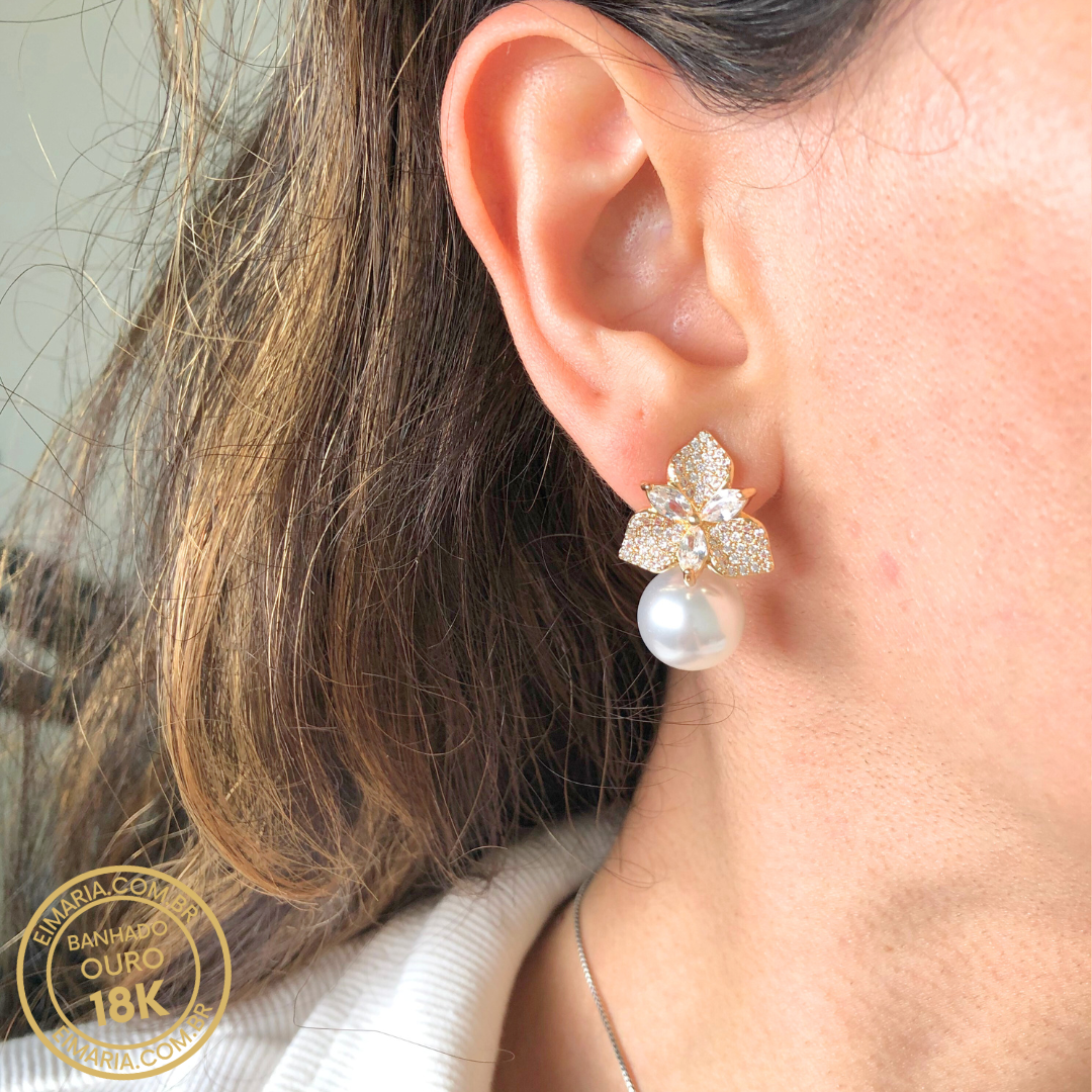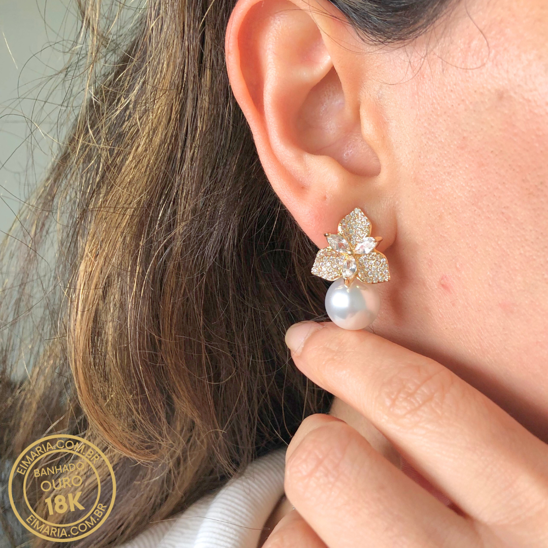 Brinco Pérola Flor: Delicado e encantador, este brinco apresenta uma flor brilhante cravejada de pequenos cristais que refletem a luz com elegância. Complementando o design, uma pérola pendurada na ponta adiciona um toque clássico e sofisticado. Esse brinco fará você brilhar a qualquer momento!