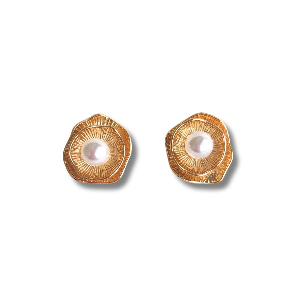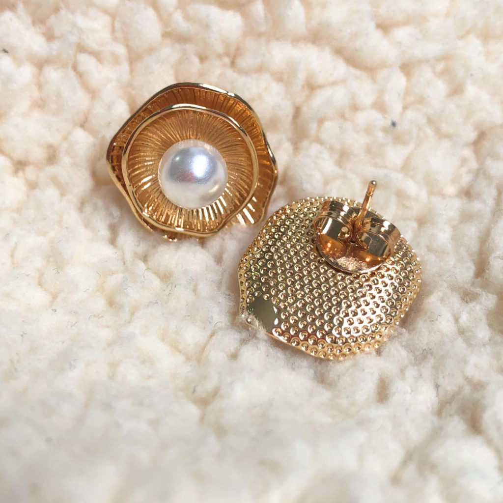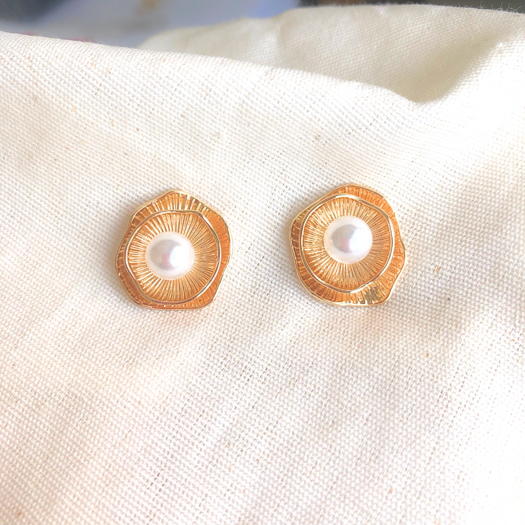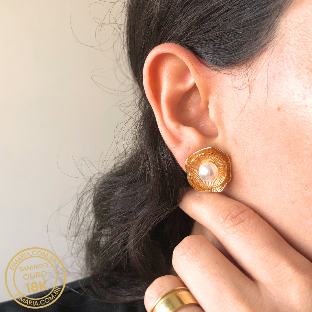 A pérola central ilumina o modelo, enquanto as linhas texturizadas ao redor criam um efeito radiante.